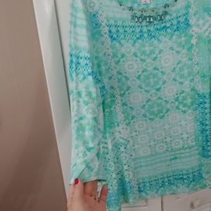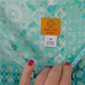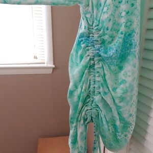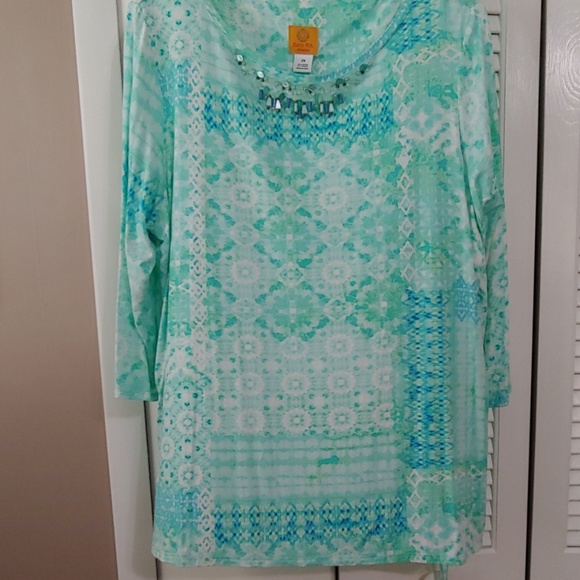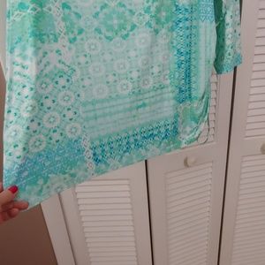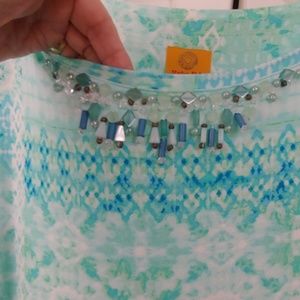 3/4 sleeve summer tunic with ruched left side to give the option of an asymmetrical hem. Very flattering and fun. Scoop neck with fun glittery beads to add some dressiness to the top. It can be worn in so many ways and the soft, yet bright colors are springy/summery. Aqua, white, blue, green.