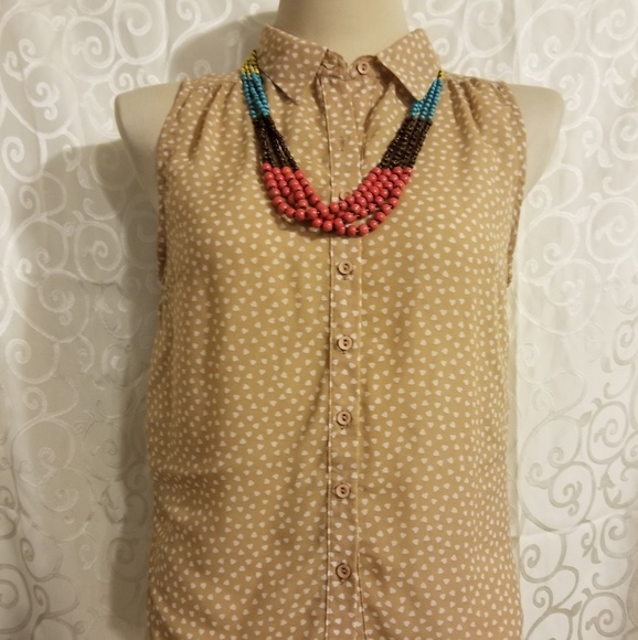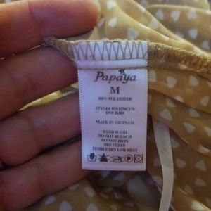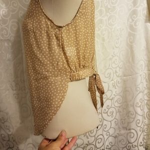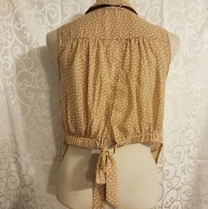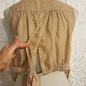 Tan top with hearts long in the front and sexy and short with tie in the back.