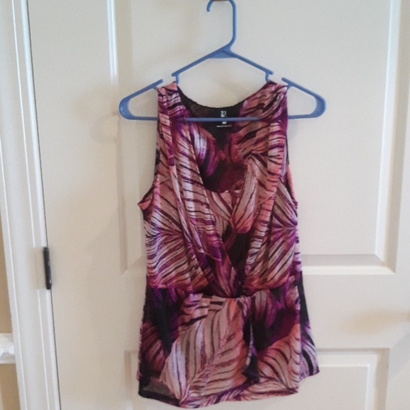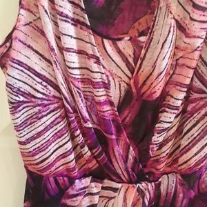 Abstract print sleeveless top; criss-cross front with built-in camy.
