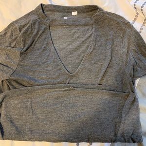 Cute top. Can be worn with just about anything. Comfy texture and built in choker.