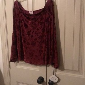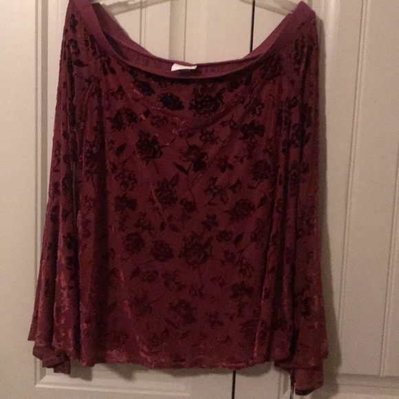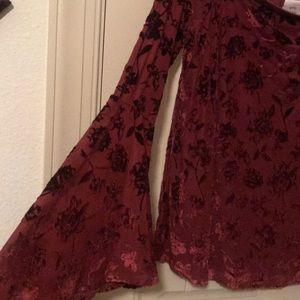 Knox Rose wine color, off the shoulder, bell shaped long sleeves, with velour/textured flower designs