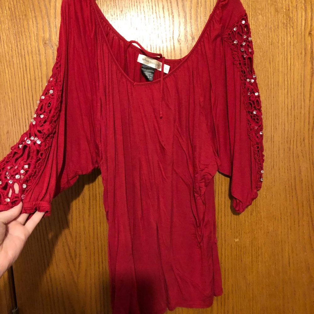 Red top with bedazzled lace sleeve