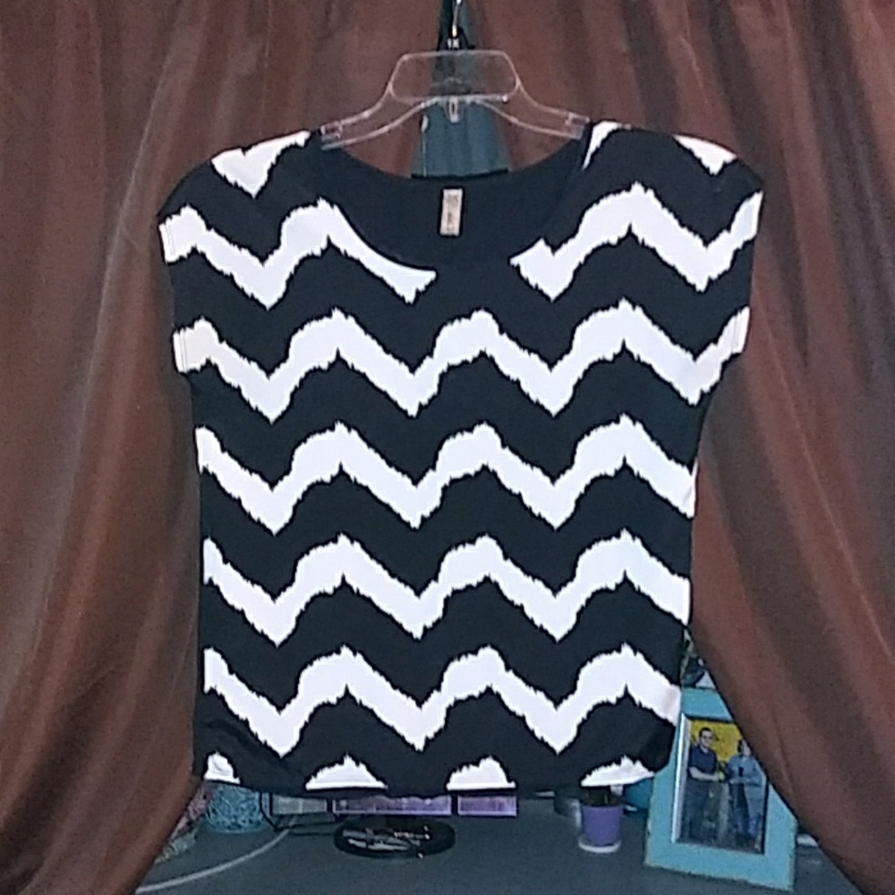 Black and white chevron patter shirt. Runs short (may be crop top on some) cannot find size tag. I would say sm/md