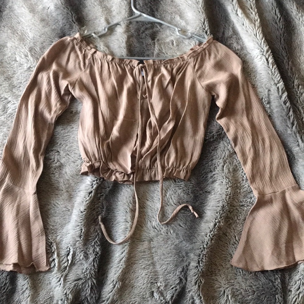 Beige flowy top with a slit down the front that ties. Never worn, in great condition with no stains or tears.