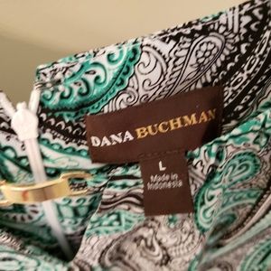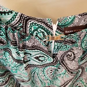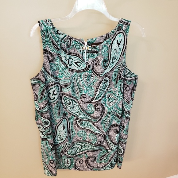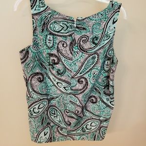 Excellent used condition. This paisley blouse has colors of black, green and white. There is a gold metal decorative piece at the neck with a v shaped hole just below. This top is perfect to wear with black shorts or pair it with dress slacks for work. It is made of 100% polyester.