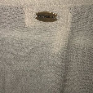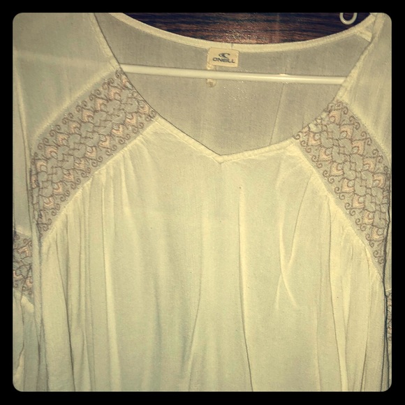 Super cute O’Neil summer shirt! Casual wear or beach wear, it fits most occasions! Gently worn, slight wrinkle but, unwrinkled you will receive it:) beige color, flowing bottom with beautiful patterned sleeves and neck..swoop style neck. The tag with size M on it, is tearing off easy cut or sew makes it an easy fix..couldn’t tell..otherwise, flawless shirt!