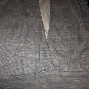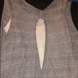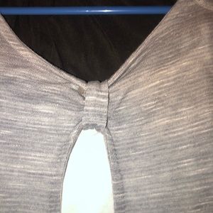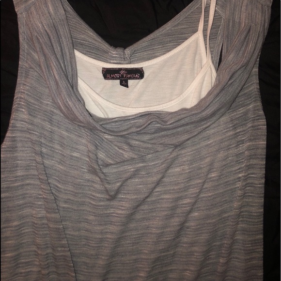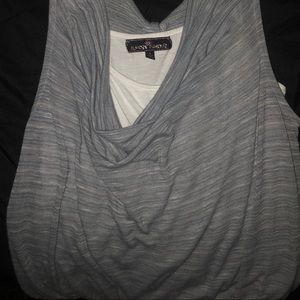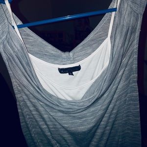 Super cute top especially for summer! Built in tank with a gray top over it swoop front and back! Outer top is a thicker but thin sweater style that has open shoulders...fitted bottom. Gently worn, no stains or rips.