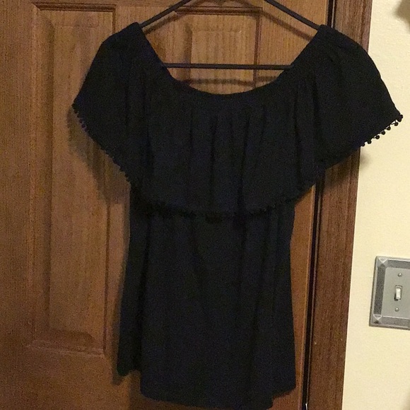 Ruff Hewn top with elastic neckline. Ruffle around entire neckline forming a sleeve.