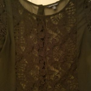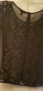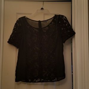 Short sleeve black sheer top with a crochet knit overlay down th middle and on sleeves. Back is sheer and has a cute button detail.