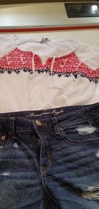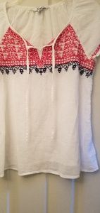 Red, white and blue for the any patriotic holiday. Really cute paired with denim. Short sleeve lightweight shirt with embroidered red, white Nd blue detail.