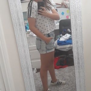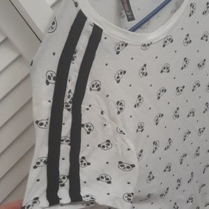 On this cute, shortcut shirt there are pandas with black rimmed. It is quite soft, comfy and stretchy. It also runs small. The size says XL but it firs like a medium.