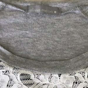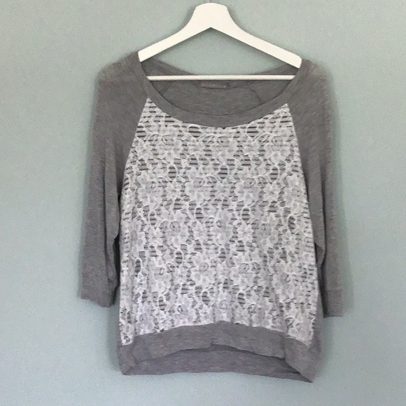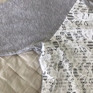 Cute top, lace overlay detail with a black and white stripe underneath. 3/4 length sleeves. Good used condition, see pictures.