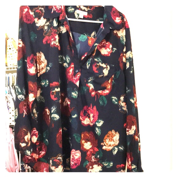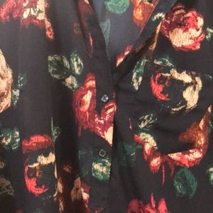 Navy blue blouse with red and peach flowers, buttons on the end the sleeves, v neck with buttons, pocket on left hand side
