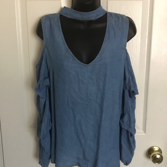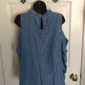 Indigo color top with open shoulders and ruffles sleeves that are 3/4 long. Brand new with tags.