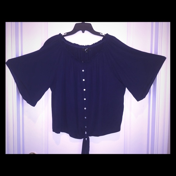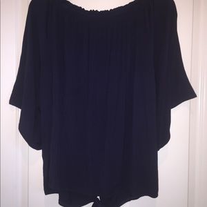 Navy blue pullover with buttons, wider sleeves 3/4 length, elastic gathered neck, longer front that can be tied in front, very soft 95% rayon, 5% spandex