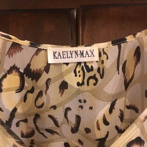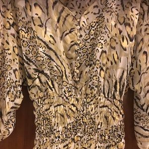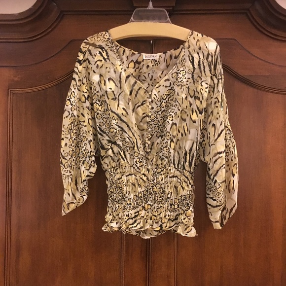 Kaely n Max printed top. Button detail down front to smocking waist. 3/4 sleeves. Gold, black,green print.