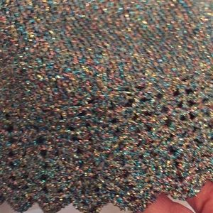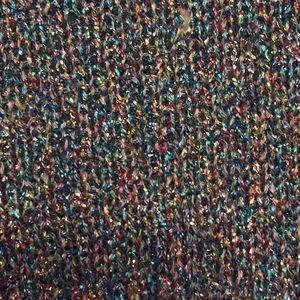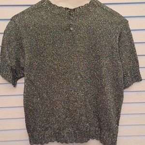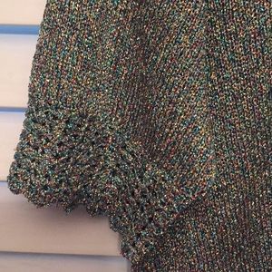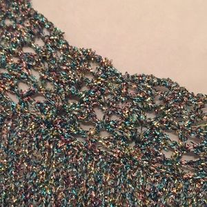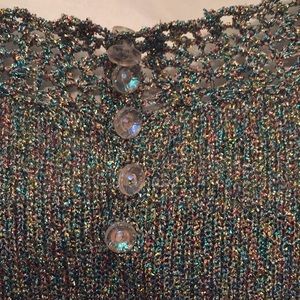 Light weight sparkling threaded woven sweater. Light enough for Summer evening. Glitzy, great quality. Small-Extra small. Buttons are in the back. Sleeves, neckline and lower top crocheted. Photo doesn’t do justice. Prettier in reality. Zoom in and Look closely at threads for better view.