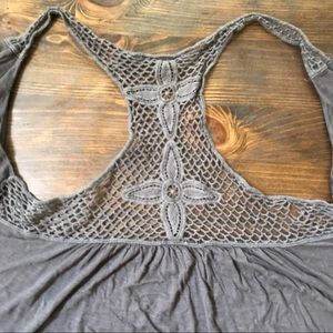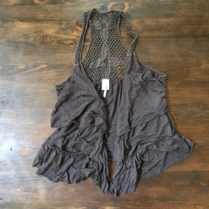 Grey ruffled layered vest with crochet back detail. So cute over a tank or tee.