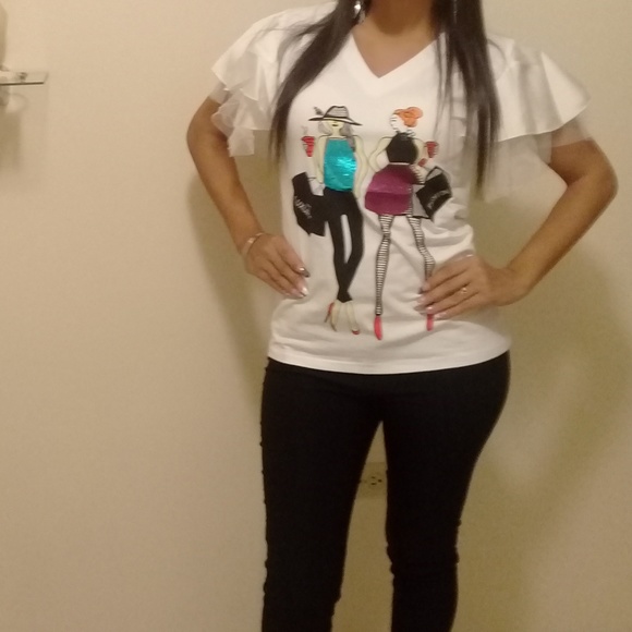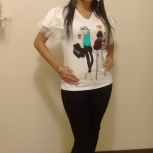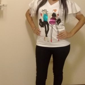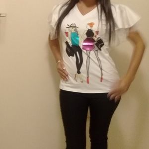 Gorgoeus V-neck with glamorous full of style sequins dressed girls in the front. The short sleeves are so elegant and fancy bringing the top to the next level.