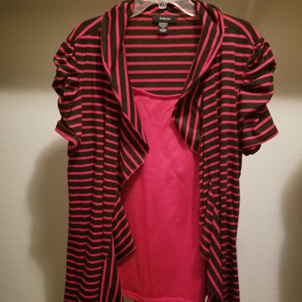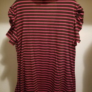 Red and black striped, ruffle sleeved top with built in red tank top under