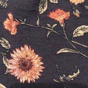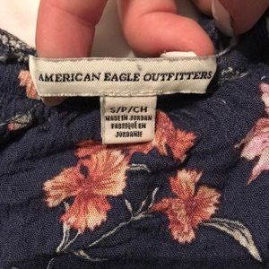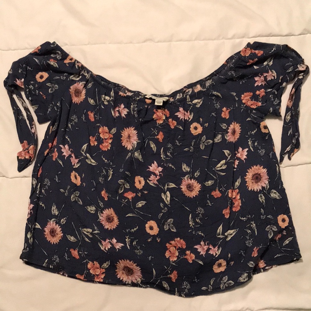 Off the shoulder blue top, with light pink flowers and ties on the arms