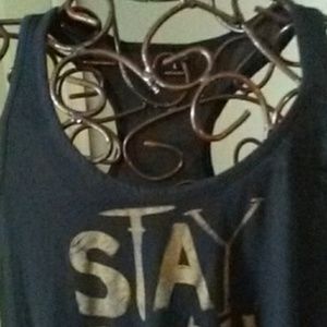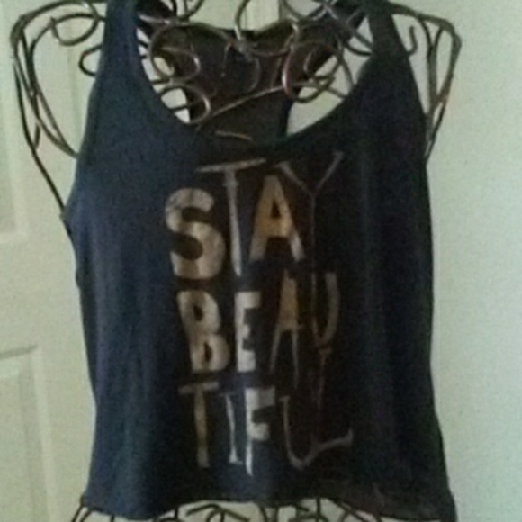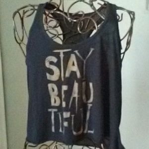 Black crop top 'Stay Beautiful'. Silky fabric in back with soft cotton front. Hangs longer on back. Simplicity with love!