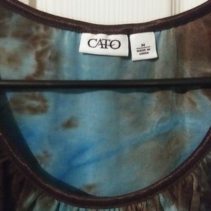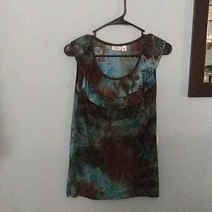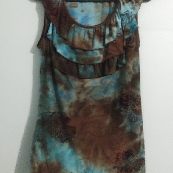 Tie died sleeveless with ruffled neckline silky material.
