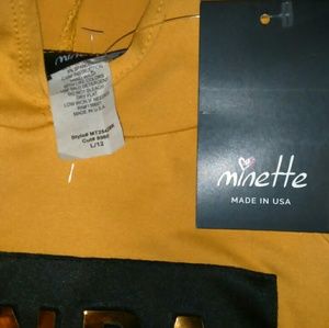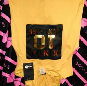 Mustard color top with no sleeves kind of 10 don't care and gold