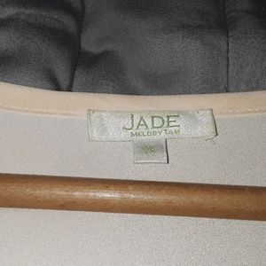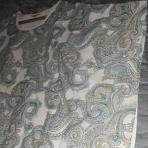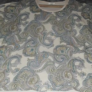 Tunic like blouse with paisley print in front. Square like oversized handkerchief. Verelegant and comfortable. Polyester. Although xs. I am medium and fits just fine.