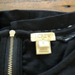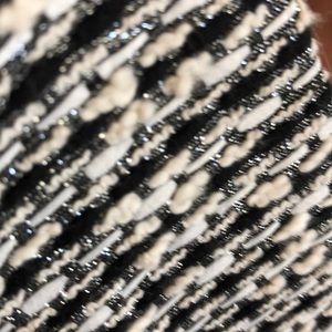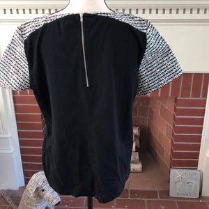 Black with woven short sleeves. There is sparkle in the woven sleeve. See picture. Zips up the back