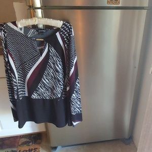 Beautiful multi colored long sleeved top w peek a boo v slit and gold at hook. Black and multi colored w light grey, wine and black. Pair with either black grey, wine slacks or skirt Fairly long.27 inches.