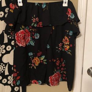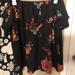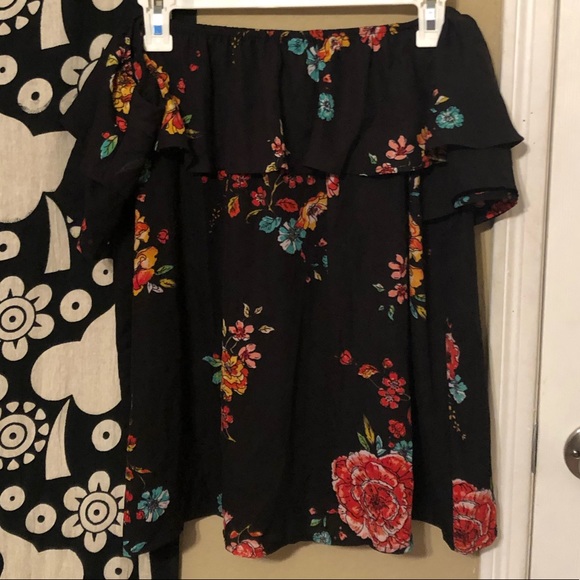 Off the shoulder Black with colorful flowers top Open in the back 100% polyester