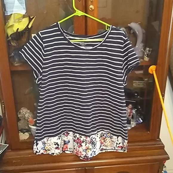 A blue and white striped tip with flowers on bottom.bought it but never wore it