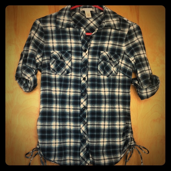 Blue/black/white flannel with above-the-elbow sleeves