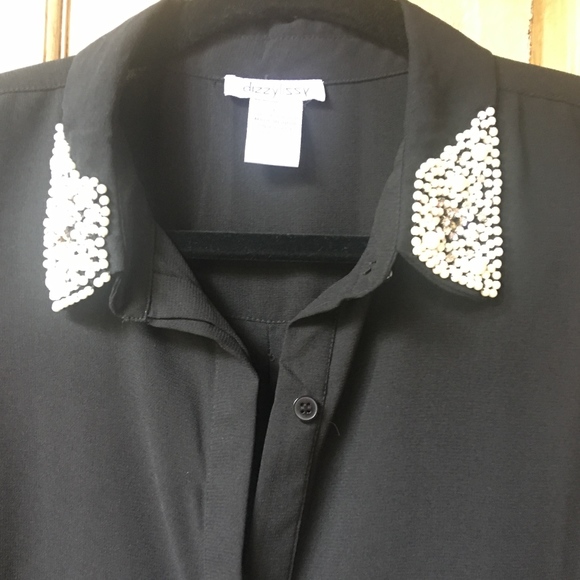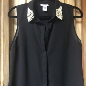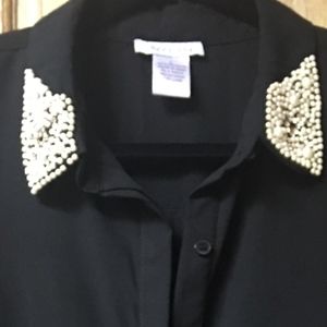 Black sheer sleeveless shirt with beautiful pearls deco on collar! It’s very classy with a feminine look to it! Never worn!