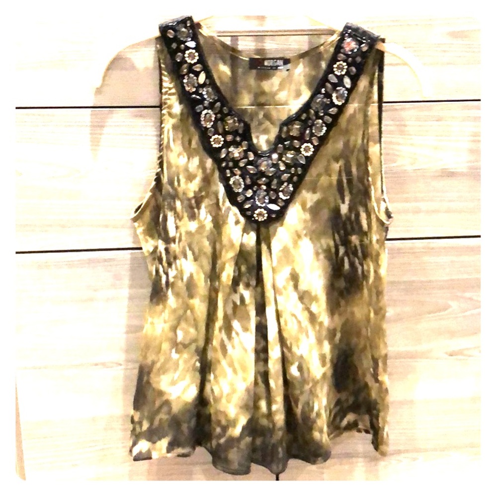 Beautiful chic military green sheer top with detailed embellishments around the v neck.