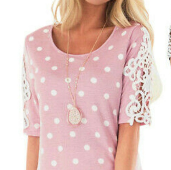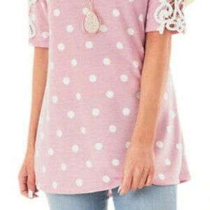 Pink polka dot cotton blend top. Crochet detailing on sleeve. Loose fit. Very cute. Size Med(ladies sz 10)Brand NEW w/o tags. Comes from a smoke-free/pet-free home