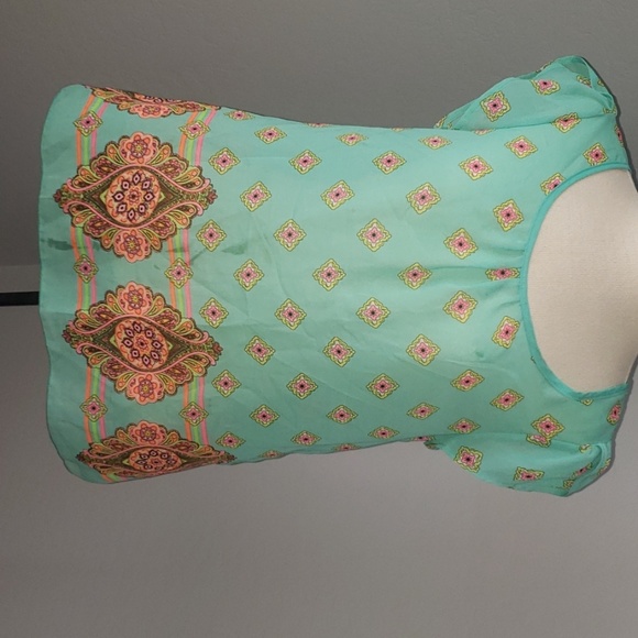Green with neon pink, yellow l and orange color designs. Size S