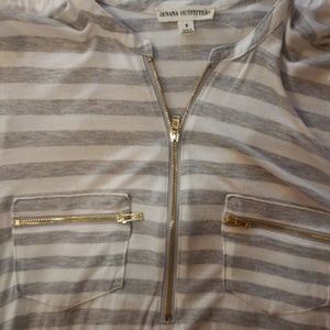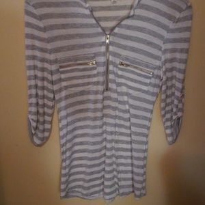Pretty theee quarter length gold embellishments can zipper up.and down and on front pockets very soft! Never worn