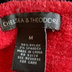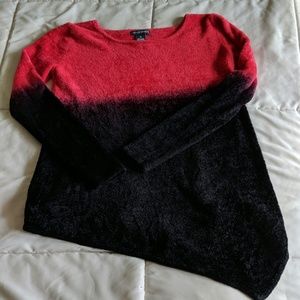 Very soft top. Very comfortable. Red flows into a purple color which flows into black. Sleeves are 23 inches. Sleek looking with angled bottom on front and back. Non-smoking home.