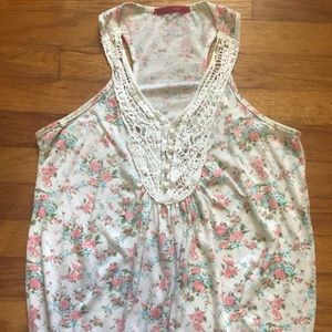 White, pink, blue and green floral top with knot at top with pearls going down the center