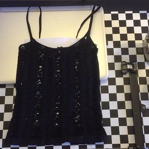 Streatchy black top. Loose weaves so it’s see through. ML but I would guess SM