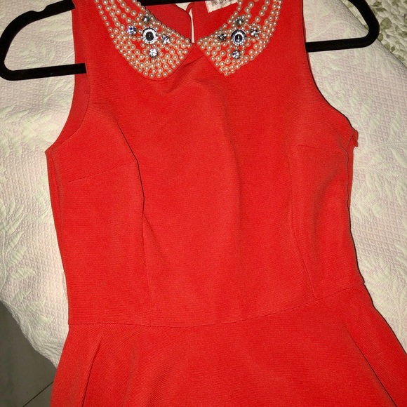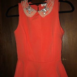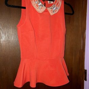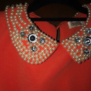 A rich orange peplum stretchy with the most gorgeous collar in pearls and crystals this delicate, elegant and extra chic top don’t let anyone indifferent. A very beautiful clothing.