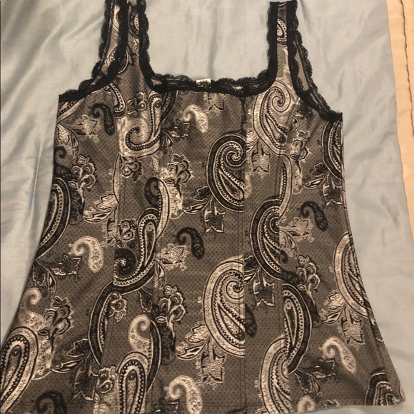 Pretty silver-grey top, black trip around neckline and sleeve cuts. Very good condition, worn a few times.