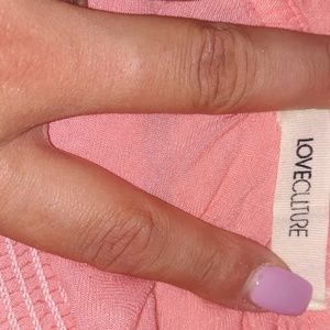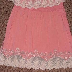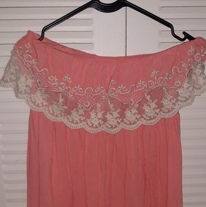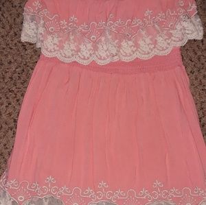 Strapless, halter top. Light pink with white lace trim around the top and bottom. Hugs right under the breast line.