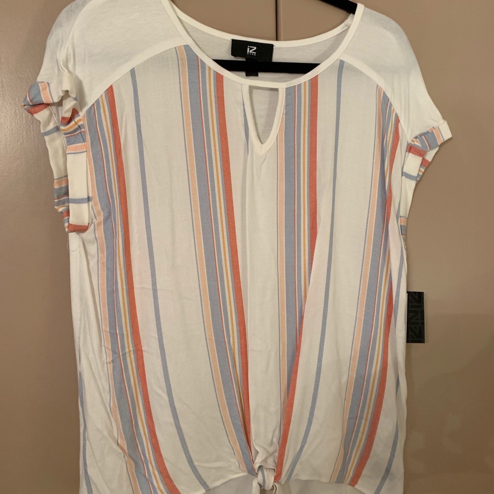 Has a little tie at the bottom not sure that the picture depicts that. Sleeves are folded over and sewn. Has tags still on it