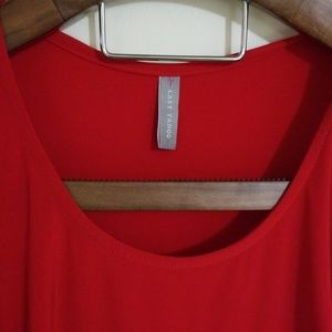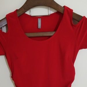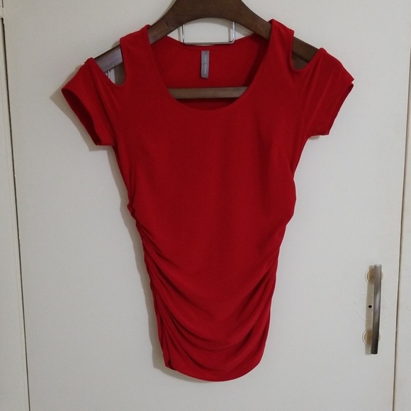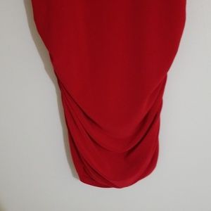 Beautiful material. Cold shoulder. Red draped bottom. Very flattering