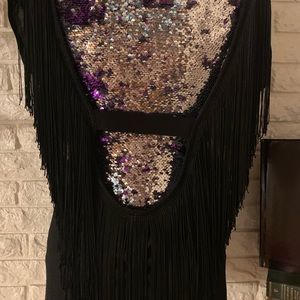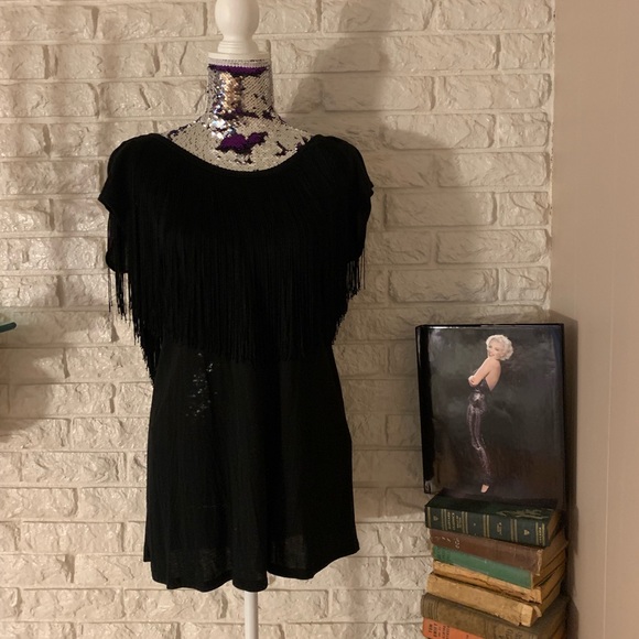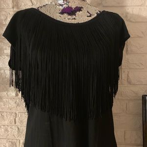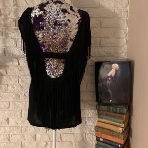This is the top to wear out on the town! Black with black fringe. Low cut back with fringe. Looks amazing with skirt, shorts, or jeans.