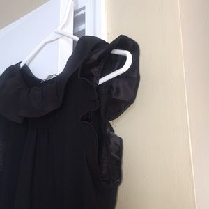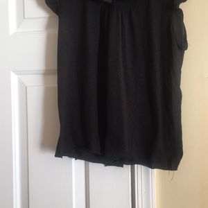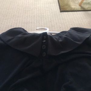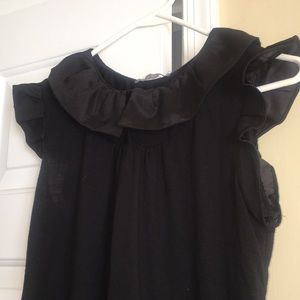 Black Top with short ruffle cap sleeve , Just adorable, 4 buttons down the front at the top, with a decorative ruffled collar. Bottom is not hemmed , I think it is adorable .☺️