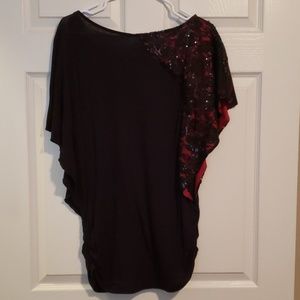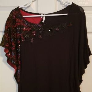 Black material, black lace with black sequin shoulder and sleeve with dark red underlay, black mesh flowers across collar with bead accents